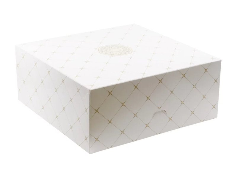 Pudełka cukiernicze z eleganckim, ponadczasowym wzorem, dodadzą słodkim wypiekom luksusowego charakteru. Delikatny, złoty nadruk najbardziej pasuje do cukierni, kawiarni, piekarni utrzymanych w klasycznym stylu. Uniwersalny wzór pudełek będzie doskonałą oprawą dla tortów i ciast zamawianych na specjalne okazje takie jak ślub, chrzest czy jubileusz. Pudełka wykonane są z wysokiej jakości tektury litej, a ich konstrukcja pozwala na i szybkie i łatwe składanie.